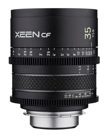 ROKINON XEEN CF lenses reflect the trend towards more compact, lightweight, and high definition cameras. They are the first full frame cine lenses to utilize carbon fiber for a sturdier, lighter, durable and more future oriented design and appearance. Carbon fiber is rarely used for precision machinery due its difficulty in molding. Credit must be given to the R&D designers who developed a technique for molding the material into the shape and size suitable for use in precise lens construction. The cost premium of carbon fiber was another challenge that was overcome to allow the CF cine lenses to remain within the reach of both renowned and aspiring cinematographers. With an average weight of only 2.12lb/.96kg and length of 3.7”/93.5mm in PL mount for all five focal lengths, they offer exceptional compatibility and flexible operation with equipment such as drones and gimbals. ROKINON XEEN CF lenses support large image sensors and 8K capability of the latest cinema cameras. The unique X-coating technology, optical design, bright T1.5 aperture (T2.6 for the 16mm), and 11 blade diaphragm can be effectively controlled to create distinctive looks, produce excellent low light performance and beautiful bokeh. Additional features are changeable mounts, a common front diameter of 95mm for easy use with matte boxes, and luminous glow-in-the-dark markings for easy operation in low-light conditions. True cine lens features include unified focus and aperture gear positions for easier follow focus use, tight color matching, dual calibrated right and left side distance and T-stop scales and incredibly smooth movement of the geared focusing and aperture controls. The ROKINON XEEN CF 35mm T1.5 augments the 16mm T2.6, 24mm T1.5, 50mm T1.5, and 85mm T1.5 CF models to form a core set of five highly versatile and capable cine primes.
